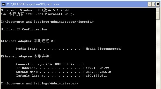 然后,进入命令行界面,在光标闪烁处输入,“ipconfig”,回车,则出现,IP address即本主机的IP地址,subnet mask即子网掩码,default gateway为网关。输入" ipconfig /all",可显示IP地址的详细信息。