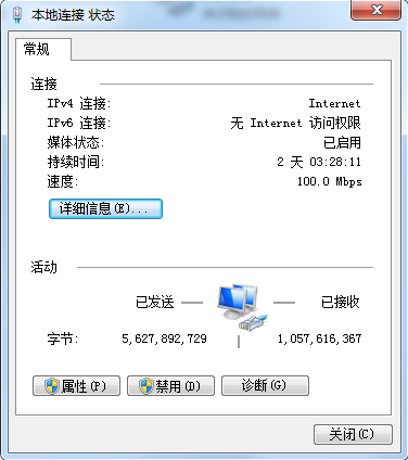 单击“更改适配器设置”,进入“网络连接”对话框,双击“本地连接”,(无线为“无线连接),出现本地连接状态对话框: