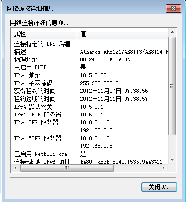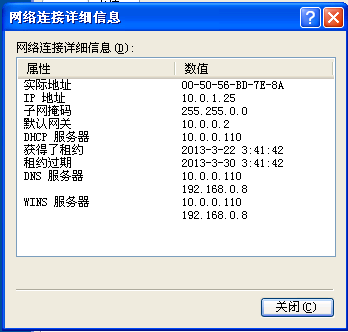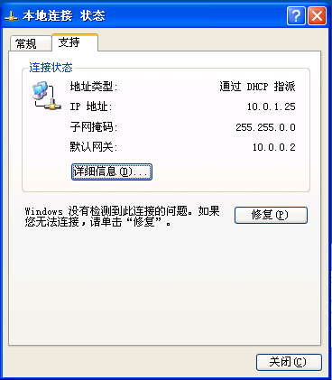 双击“本地连接”,出现本地连接状态对话框。选择“支持”选项卡,点击“详细信息”按钮,打开如下对话框,就可以看到详细的IP地址信息。