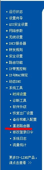 6.重启路由器,在左侧,点击系统工具,选择重启路由器,进入右侧界面,选择重启路由器,等待一分钟,如图: