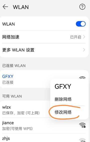 1、打开手机WIFI设置界面,连接GFXY,按住“GFXY”,弹出菜单中,选择“修改网络”;