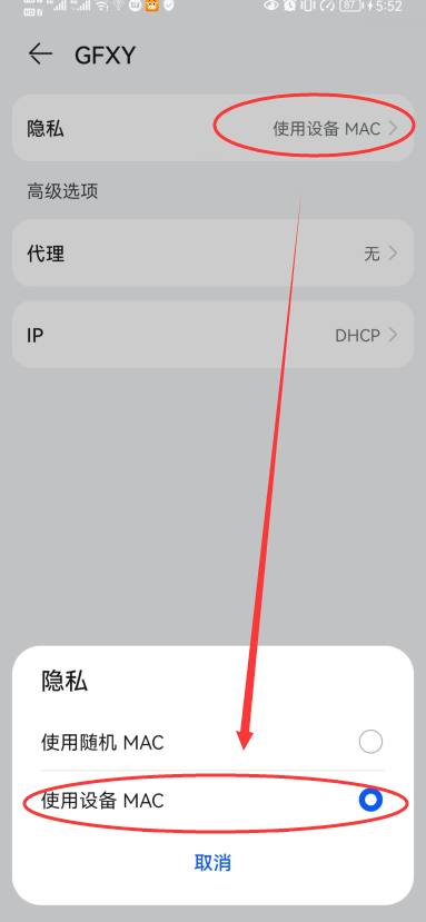 2、在“隐私”选项中选择”使用设备MAC“,即可正常免认证。