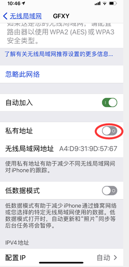 解决方法:进入WiFi设置,比如连入GFXY,在详细设置中,将“私有地址”关闭。