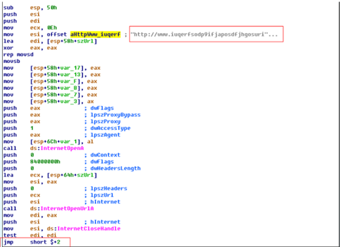 该病毒通过KillSwitch域名开关进行控制,当病毒可以正常访问该域名(www.iuqerfsodp9ifjaposdfjhgosurijfaewrwergwea.com)时,病毒则终止其本身的运行和传播,不会对主机造成任何破坏。