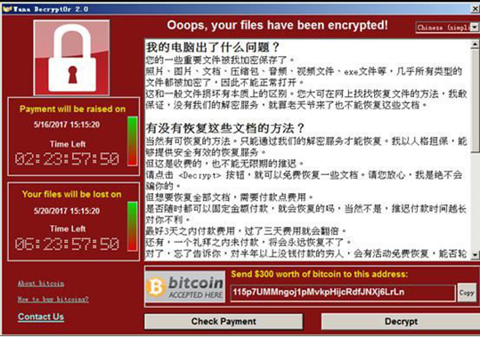 又名Wanna Decryptor,它是蠕虫式病毒,它是通过MS17-010漏洞在全球范围内爆发,并短时间内感染大量的主机;该蠕虫感染了主机后,会向计算机中植入敲诈者病毒,导致电脑大量文件被加密。受害者电脑被黑客锁定后,病毒会提示支持价值相当于300美元(约合2069人民币)的比特币才可以解锁;目前已经波及99个国家。