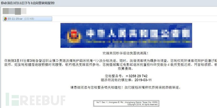 自2019年3月11日,境外某黑客组织对我国有关政府部门和教育机构等开展勒索病毒邮件攻击。受害者邮箱会收到一封邮件,标题为“你必须在3月11日下午3点向警察局报到!”邮件内容则是一个以日期命名的 rar 格式压缩包。而根据捕获的样本来看,压缩包中的伪装文件并不大一样,有的是乱码的exe可执行文件,也有用“XXX.doc .exe”这种包含多个空格,以此来伪装成word文件的,也有直接伪装成PDF文件的,花样繁多。只要受害者警惕性低的情况下打开了病毒文件,结果都只有一个。电脑中文件被加密,并随即添加文件后缀,并“贴心地”告诉你如何如何支付赎金。