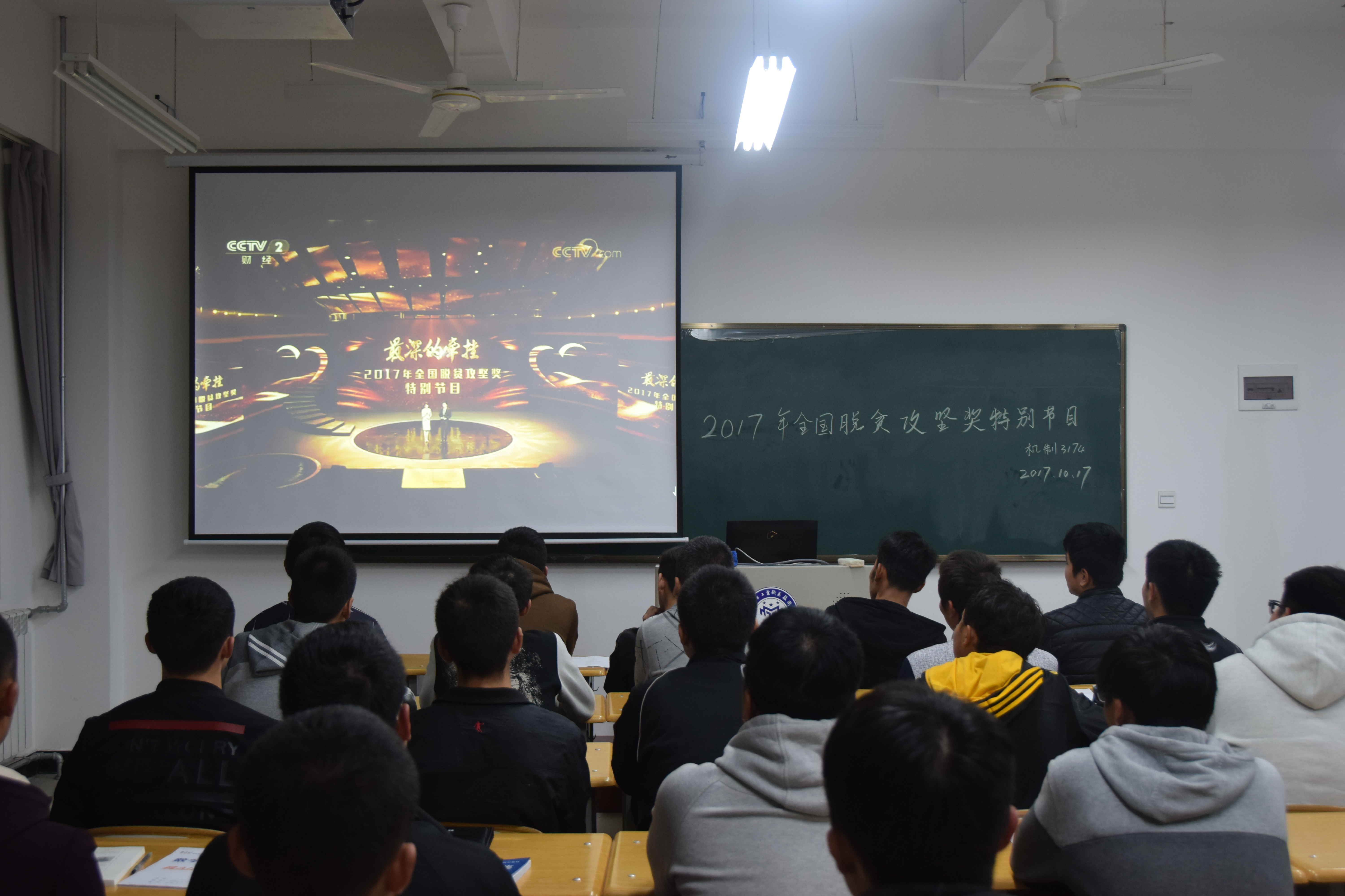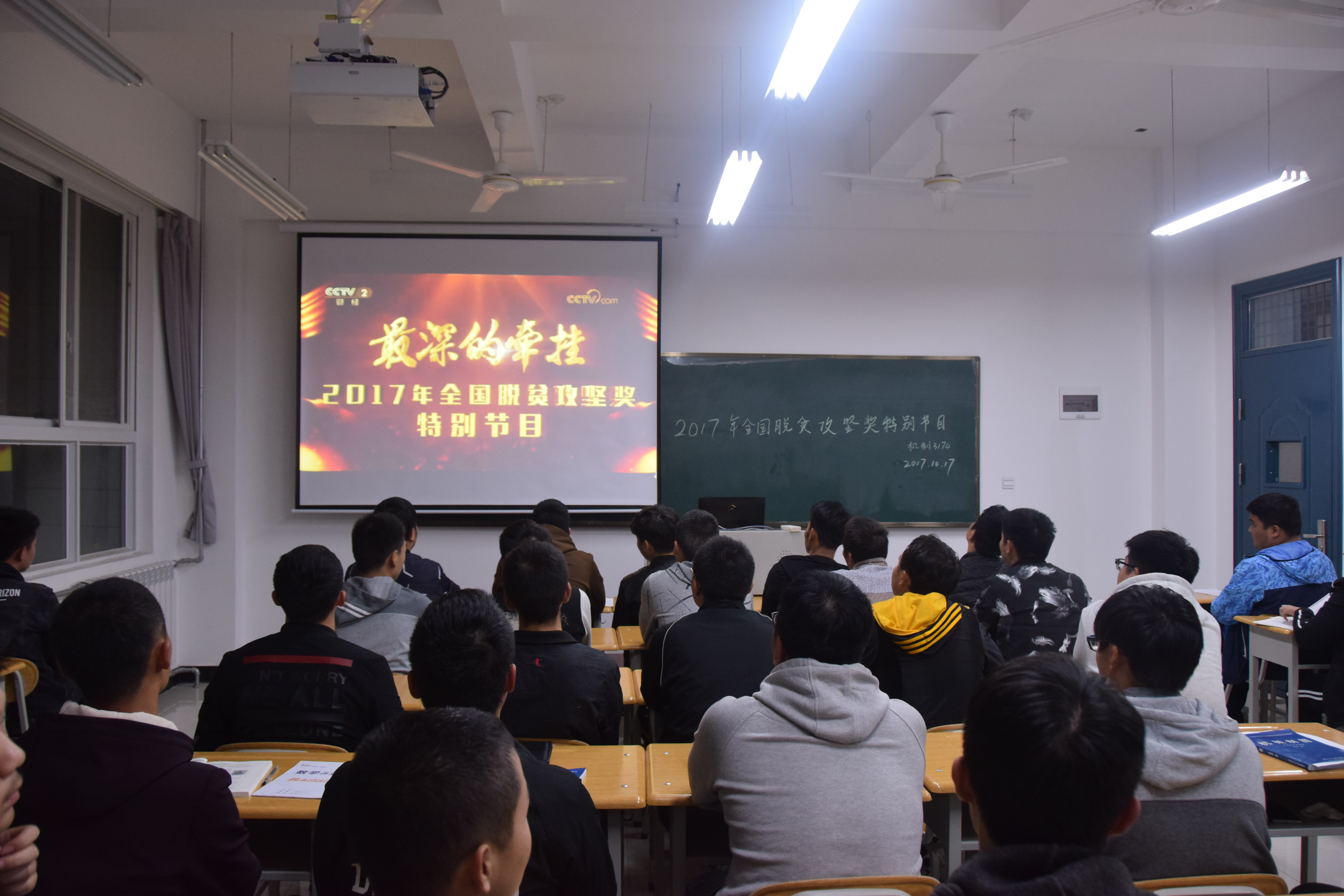 10月17日,学校领导与学生代表一同在教二报告厅观看中央电视台二套直播——2017年脱贫攻坚奖特别节目,同时我校学生处组织学院14000余名同学在各班组织观看相关新闻,共同向获奖的同志学习。