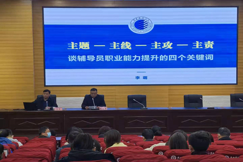 为进一步强化辅导员队伍建设,促进辅导员队伍素质能力提升,25日下午,我校特邀请陕西科技大学学工部副部长李萌老师,为我校全体辅导员做了一场主题为“主题 主线 主攻 主责——辅导员专业化成长的四个关键词”的专题讲座。本次讲座由学工部部长杨晓平主持。
