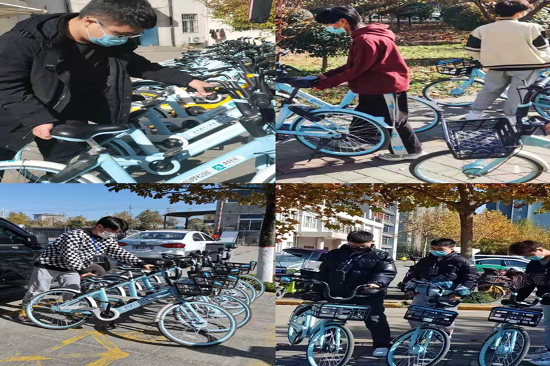 学生干部们对校园内的路标、指示牌、公共设施进行安全检查;将校园内乱停乱摆的共享单车放置在单车停放点;如遇到乱停单车的不良行为及时进行制止并告知单车使用者正确的停放地点。