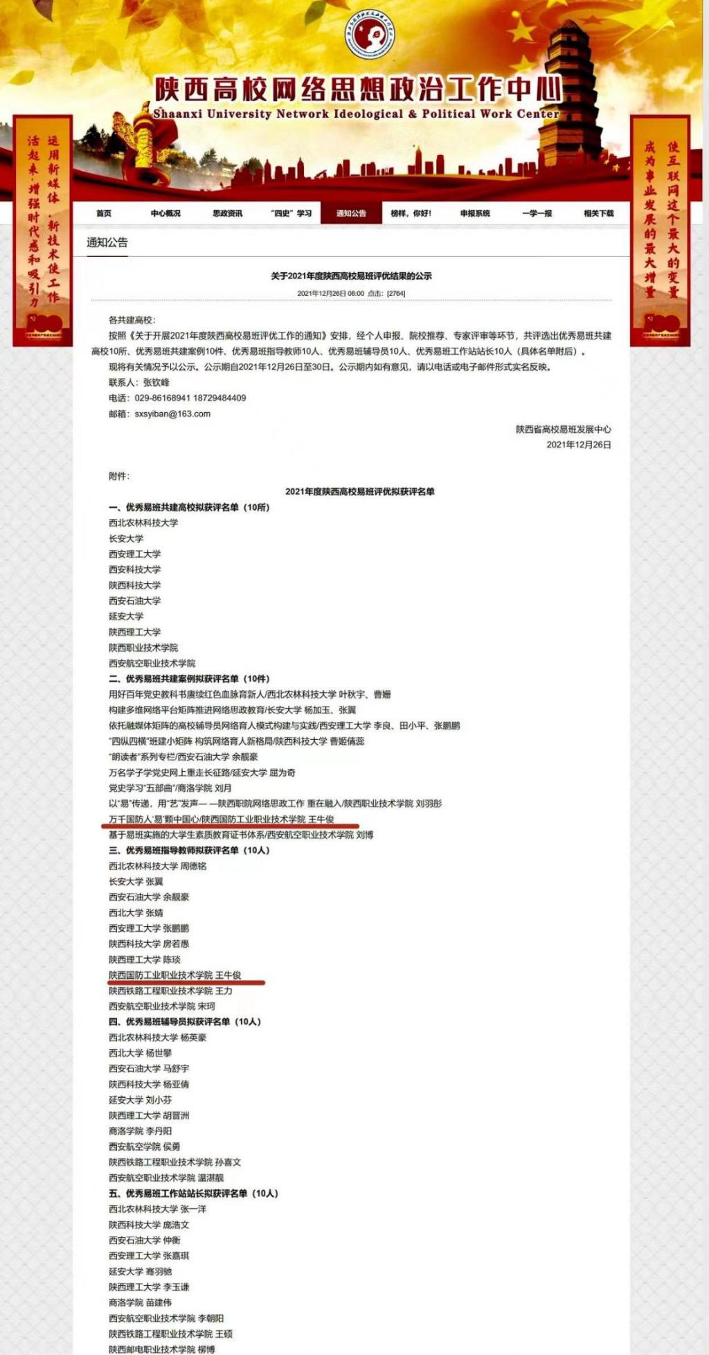 我校易班发展中心经过前期准备,积极申报相关奖项,2021年度我校思政案例《万千国防人 “易”颗中国心》被评为“陕西十佳优秀易班共建案例”,指导教师王牛俊被评为“陕西十佳优秀易班指导教师”。本次年度评优工作所获两项荣誉为我校2021年度易班工作画上圆满句号,也是对我校易班工作的充分肯定。