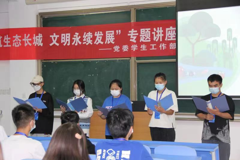 本场讲座由李卓聪同学担任主讲,他向我们阐述了在日常生活中采用节能、节水、环保、再生等绿色产品的重要性,积极引导各位同学努力提升校园绿化、美化、清洁化水平;同学们还自发组织了生态文明主题诗朗诵,发出从自身做起,从点滴小事做起,不剩饭不剩菜、主动关灯、清洁卫生的倡议。孙萌在讲话中表示,生态文明建设是关系中华民族永续发展的根本大计,作为青年学生要牢固树立社会主义生态文明观,推动形成人与自然和谐发展现代化建设新格局。