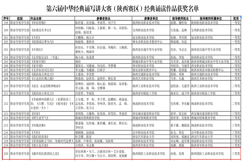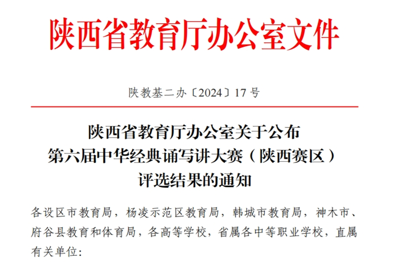 2024年9月11,第六届中华经典诵写讲大赛(陕西赛区)评选结果揭晓,我校报送的2项参赛作品均获得佳绩。其中,孙萌、范爽老师指导的作品《盛开的民族团结之花》荣获职业学校学生组三等奖,王牛俊、张钊老师指导的作品《百年交响》荣获教师组三等奖。