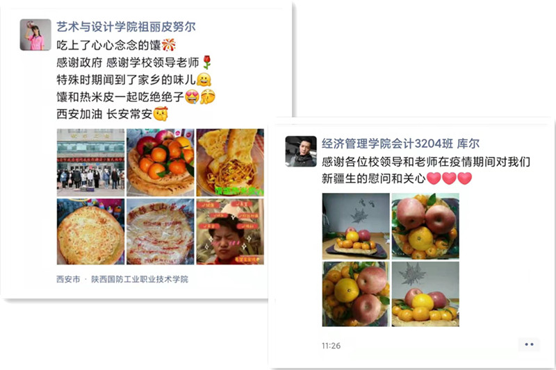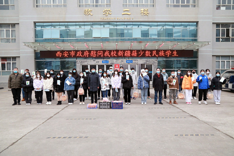 隔离不隔爱,“疫”线送温暖。西安疫情暴发,形势依旧严峻复杂,在疫情防控攻坚时期,西安市政府来我校慰问新疆籍少数民族学生,带来了一批带有家乡味道的爱心馕,学校将市政府的爱心馕以及学校准备的口罩、水果等慰问品送到了南北校区34名在校新疆籍少数民族学生手里,把爱传递到少数民族学生的心里。我校党委副书记杨聪、校疫情防控办、学工部以及二级分院相关负责人参与了本次活动。