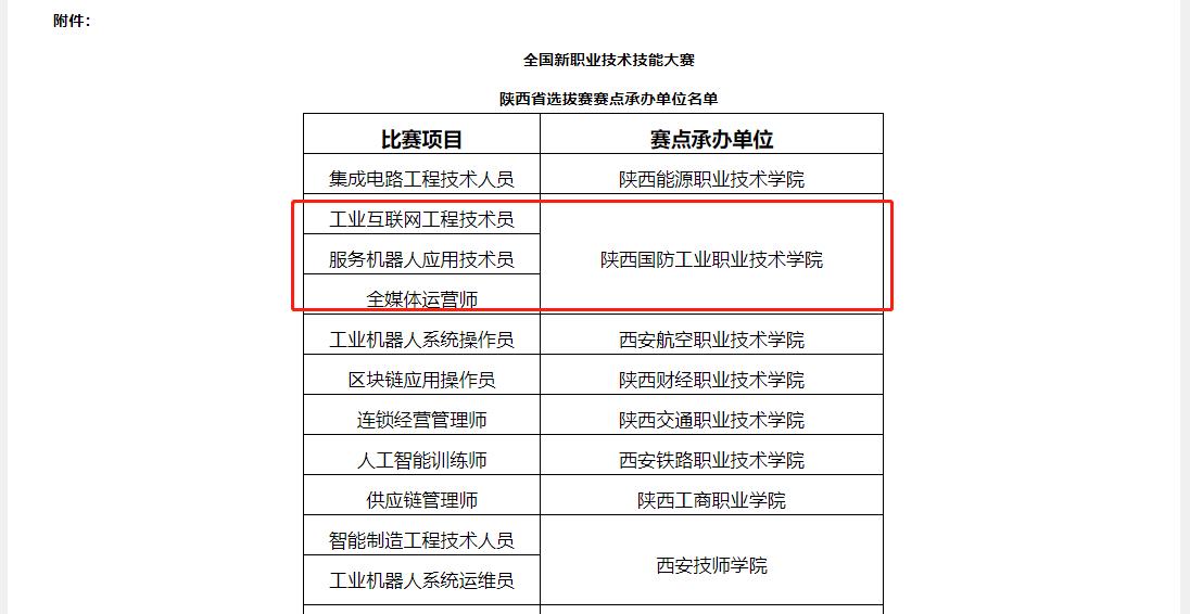 近日,陕西省人力资源和社会保障厅发布了《关于2021年全国新职业技术技能大赛陕西省选拔赛赛点承办单位的公示》,我校申报承办的“工业互联网工程技术员”、“服务机器人应用技术员”和“全媒体运营师”3个赛项获批成为2021年全国新职业技术技能大赛陕西省选拔赛赛点,为全省承办赛项最多的院校,通过比赛选拔的优秀选手将代表陕西省在2021年12月参加杭州市举行的全国新职业技术技能大赛。学校将按照陕西省人社厅的要求,广泛发动,积极筹备,认真做好选拔赛的计划制定、组织、宣传、实施及保障工作,完成相应赛项承办。