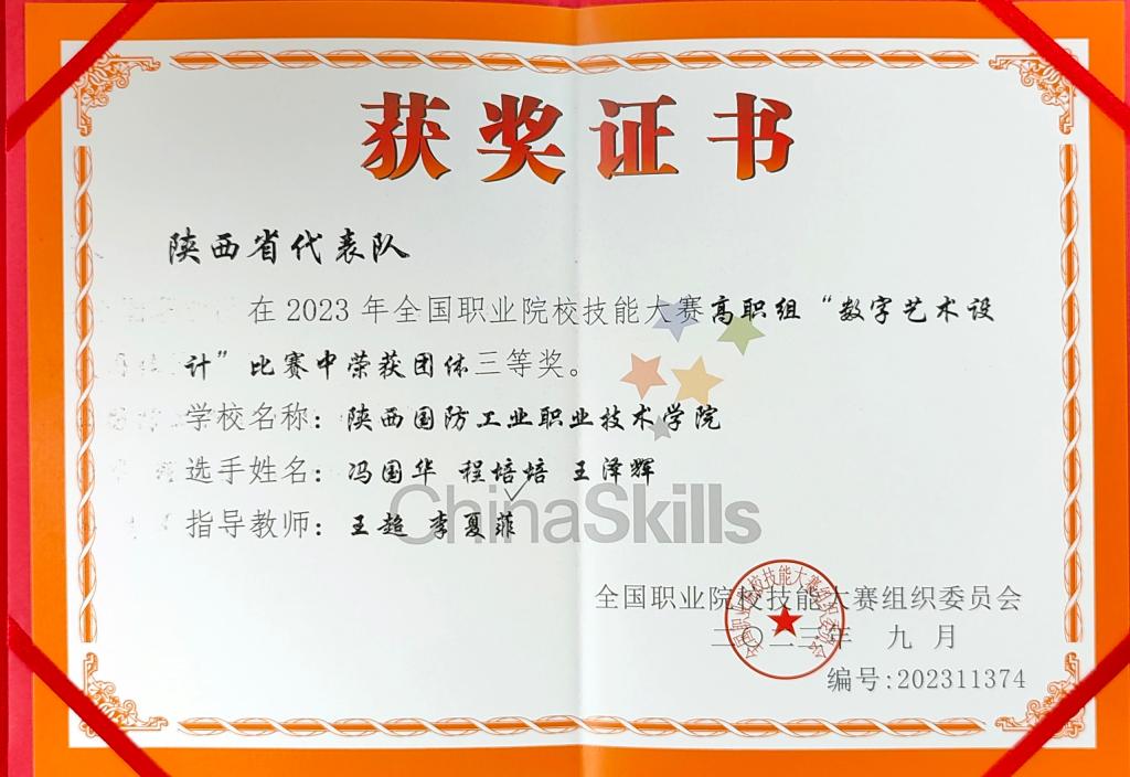 2023年9月26日,全国职业院校技能大赛“数字艺术设计”在天津中德应用技术大学举办,来自29个省(市)自治区63支代表队的189名选手参加了比赛,我校艺术与设计学院王泽辉、程培培、冯国华三位学生代表陕西省参赛,在比赛中荣获“数字艺术设计”团体三等奖。