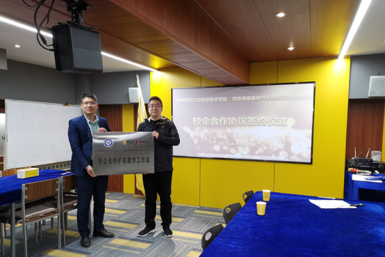 随后,汽车工程学院院长赵熹与贺总经理签订了校企合作协议,并由赵院长代表学校授予西安美德星辉汽车维修服务有限公司“校企合作扩招教学工作站”牌匾。