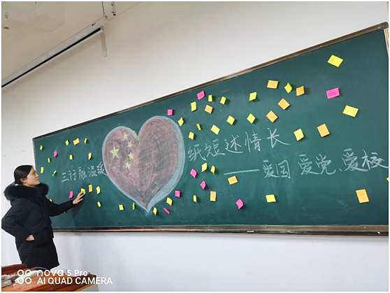 为了加强加深同学们的爱国精神,丰富同学们的课余生活,提高当代大学生的自我修养,设计3191、3192班于12月19日晚7:30分在4-535举办了主题为“三行融温暖,纸短述情”的主题活动。活动中同学们积极踊跃的参加,涌现出一大批同学对党和国家最真挚的祝福与期待。