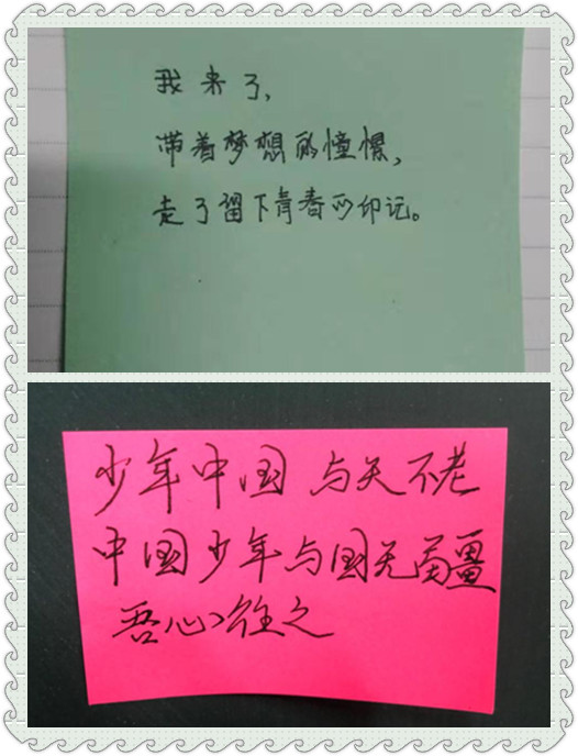 “少年中国与天不老,中国少年与国无疆。吾心往之”。这句话写出了一个当代青年大学生对祖国母亲的美好祝愿以及自己对祖国未来的无限憧憬。这句话写出了当代大学生青年作为伟大祖国的一员所拥有的幸福感以及获得感。这次活动中有许多同学把在学校的学习生活总结成了三句深情地写在了纸上,正如纸上所写来到这所美丽的学校之前大家都满是憧憬。也都在学校的每一个角落留下了自己青春的印记。