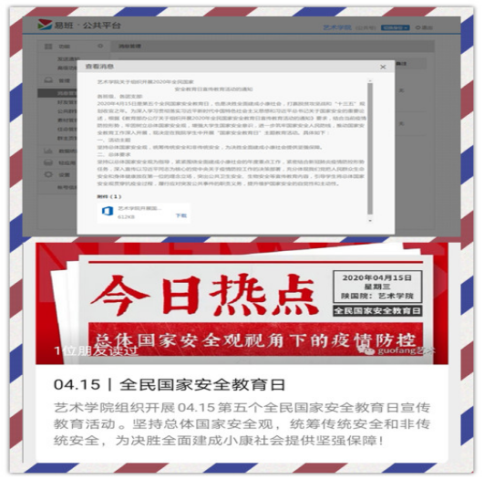 此次全民国家安全教育日活动以线上宣传学习和线下实践、记录相结合的方式展开。学院利用班级QQ群、微信群、易班推文等网络途径,向学生推送宣传国家安全教育日活动海报、视频等,广泛宣传学习国家安全的重要性和必要性。
