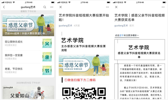 本次比赛意在以不同的方式表达同学们对父亲的爱,参赛作品题材不限。比赛共分为三个环节,首先,参赛同学利用抖音app制作短视频,然后由班长收集整理,提交到学院。随后,在全校范围内利用线上投票的方式进行评选,决出一二三等奖。最后,由艺术学院在公众号上发布本次大赛的获奖名单。本次大赛出现了诸多不同题材的短视频,有原创手绘的微视频,有饱含深情的个人独唱、有大气浑然的书法展示、也有精彩缤纷的手指舞演绎,尽管形式不同,但大家都在以各自的方式来诉说自己对父亲的爱。