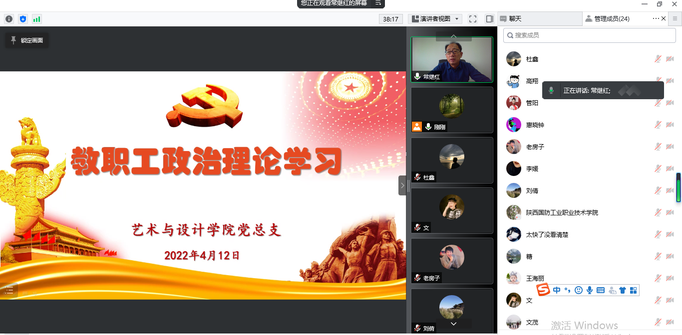 根据学校《关于2022年4月份教职工政治理论学习安排的通知》(陕国职党宣〔2022〕6号)文件精神,艺术与设计学院党总支于4月12日上午10:30,组织全体教职工通过线上腾讯会议开展了四月份教职工政治理论学习会议,会议由艺术与设计学院党总支书记常继红主持。