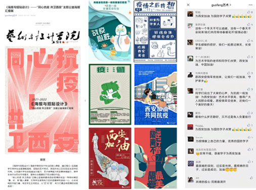 随着线上教学的深入,为进一步应对教学新挑战、破解教学新难题,进行有效的教学模式改革,学院结合设计类专业特点,创造性地推出——“云展览”,以展促学,以展促教。先后在学校网站、学院公众号展出《大学生公共艺术鉴赏与实践》《设计素描》《3Dsmax效果图制作》等7门课程共计500余幅优秀学生作品。在检验教学成果的同时,为今后的教学与教改提供了案例与数据支撑,有效补齐家校互动短板。特别是《海报与招贴设计》授课教师李媛通过分享抗疫一线典型事迹,赏析优秀“抗疫”主题公益类海报案例,引导学生感悟生命至上、举国同心、舍生忘死、尊重科学、命运与共的伟大抗疫精神和团结一心、众志成城、无坚不摧的中国力量,指导学生创作并展出“同心抗疫 共卫西安”主题公益海报作品200余幅。