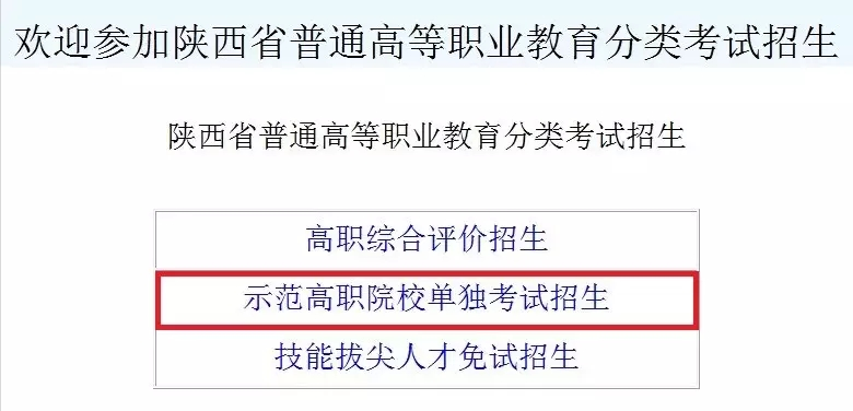 方式一:登录陕西省招生信息考试网(http://www.sneac.com),进入“陕西省普通高等职业教育分类考试招生——示范高职院校单独考试招生”报名入口申报。