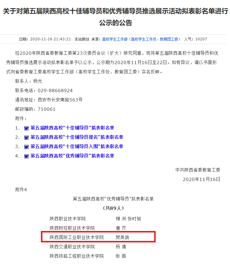 11月16日,中共陕西省委教育工委下发了《关于对第五届陕西高校十佳辅导员和优秀辅导员推选展示活动拟表彰名单进行公示的公告》,我校智能制造学院辅导员樊英鸽老师获陕西省第五届高校“优秀辅导员”称号。