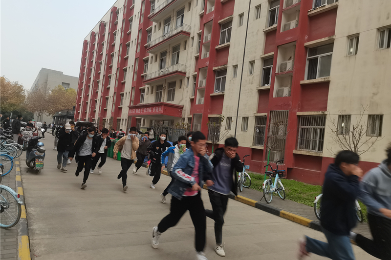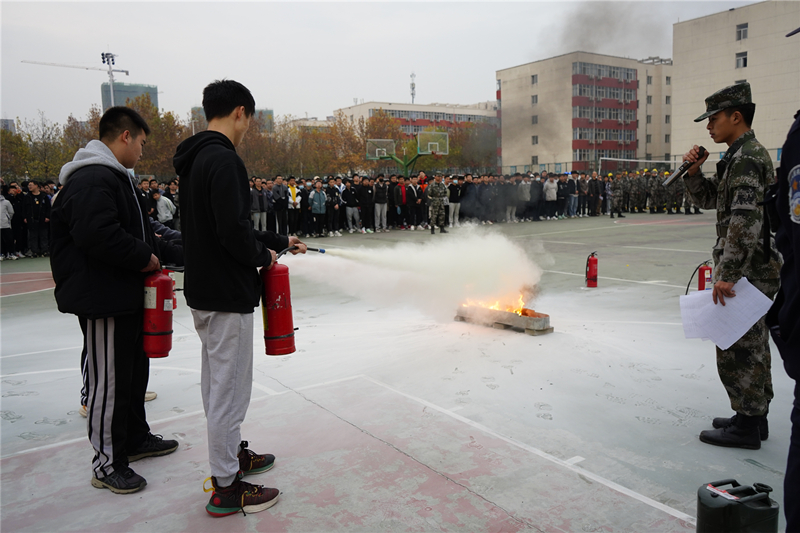 随着消防报警声的响起,各班同学沉着冷静,用湿毛巾捂住口、鼻,尽量将身体放低,紧急撤离宿舍区域,安全、快速、有序地疏散到操场安全区域,由辅导员清点班级人数。全体师生仅用了3-5分钟即全部安全到达指定区域,未发生人员伤害情况。演练结束后,军魂学社学生代表向师生们讲解灭火要点并现场示范。最后,学生们现场参与灭火器现场体验环节,以3人为一组在指定地点使用干粉灭火器进行实操灭火,以便当真正遇到起火时,能够冷静正确利用灭火器熄灭火源 。