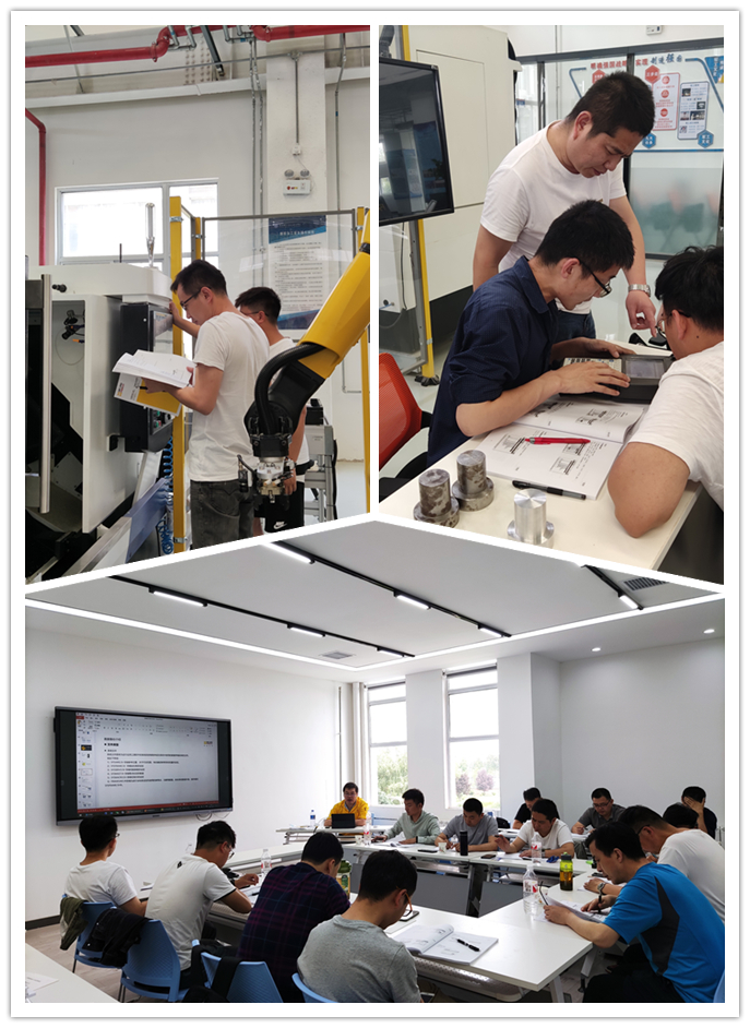 此次培训由智能制造实训基地教师和北京发那科机电有限公司工程技术人员共同担任培训讲师,针对工艺设计、设备维护、操作编程、生产加工等岗位,涵盖切削加工单元认知、机器人基础操作与自动上下料、机床基础操作与自动化改造、切削加工单元设备间网络通讯、切削加工单元典型逻辑分析与联调验证等内容。培训工作由学院和企业共同设计开发,培训标准高度对接岗位工作要求,培训内容紧密对接企业实际生产,对企业员工理论知识拓展、技术技能提升、生产实践经验积累起到了较大的促进作用,获得学员们一致好评。