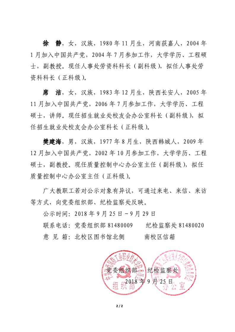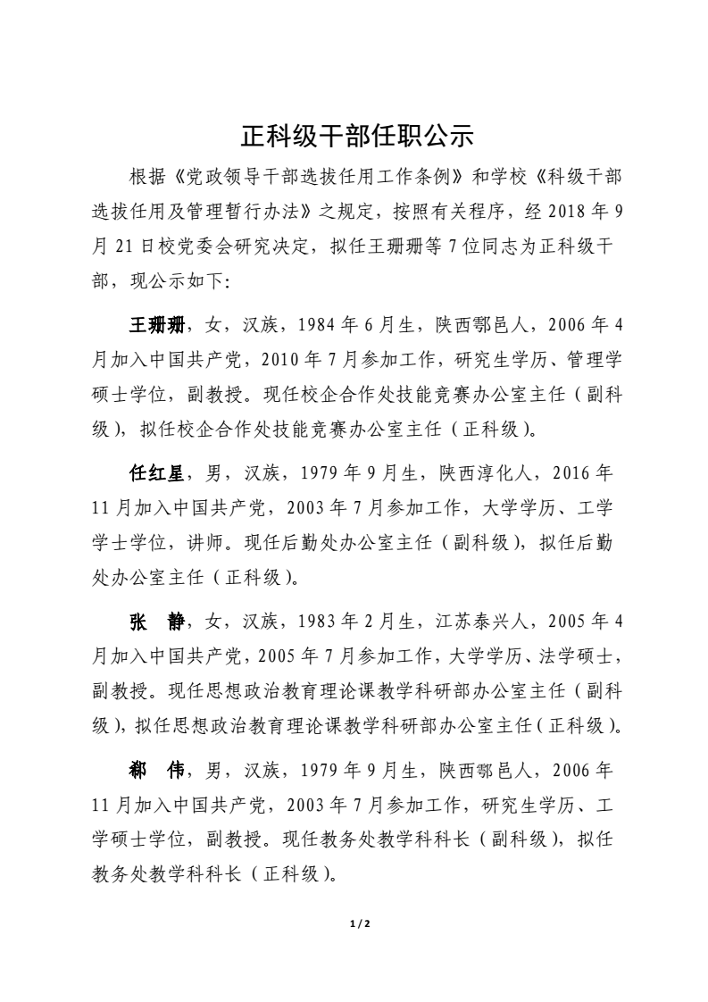 正科级干部任职公示